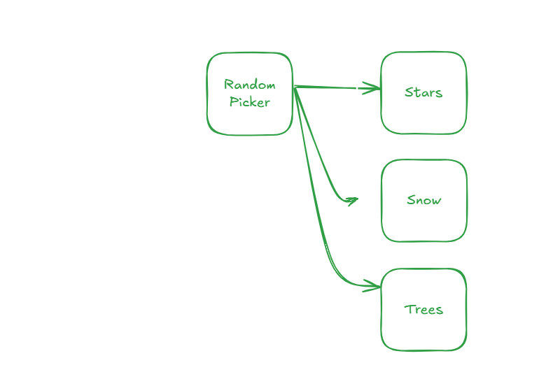 Eventually I settled on the idea of doing a random surprise, inspired by a fruit machine, or the item box in Mario Kart – the viewer presses a button, which triggers a carousel of Christmassy options to roll around for a few seconds, and then one is picked at random, to trigger a ~15 second themed sequence before returning back to the regular show.