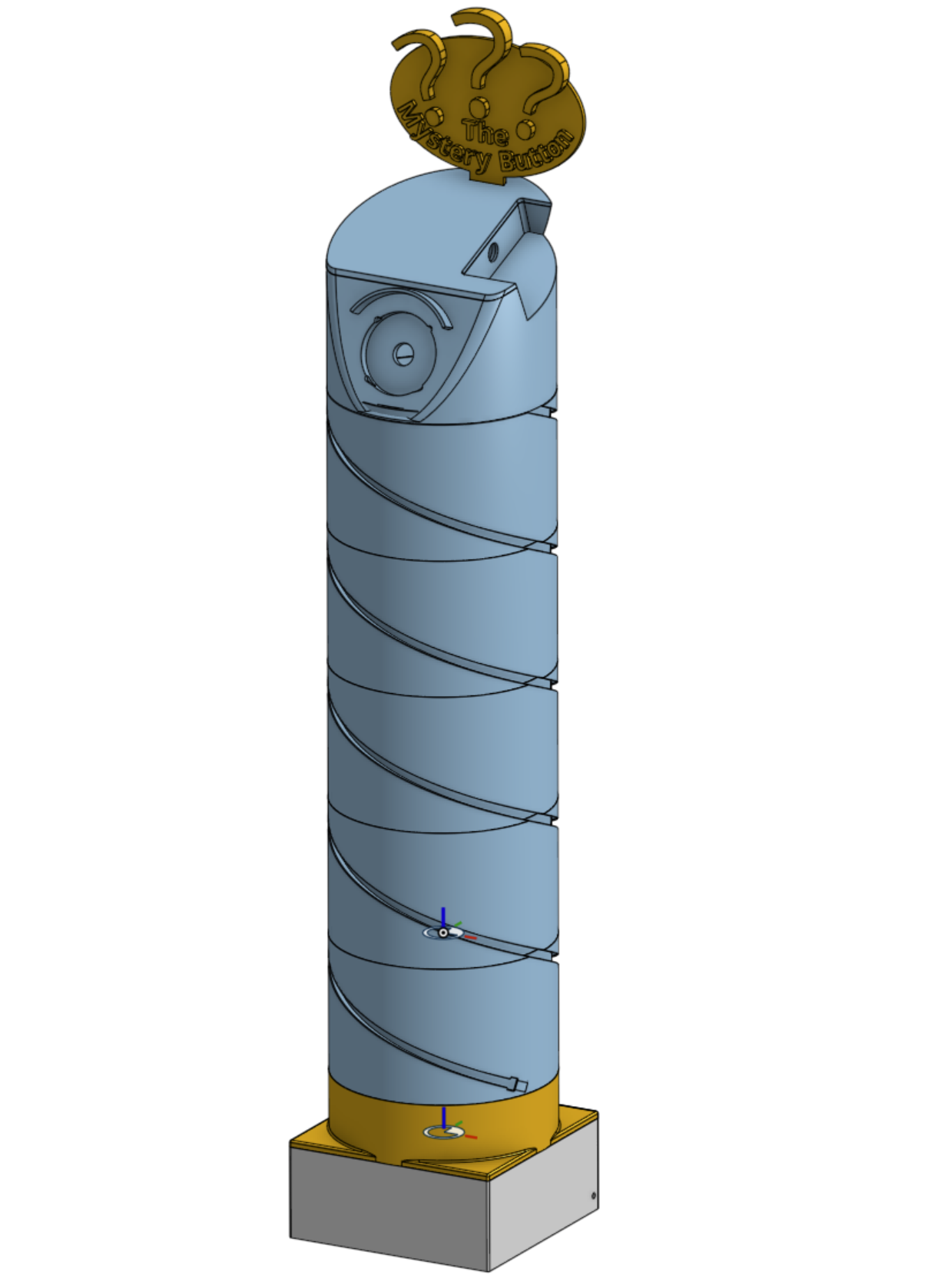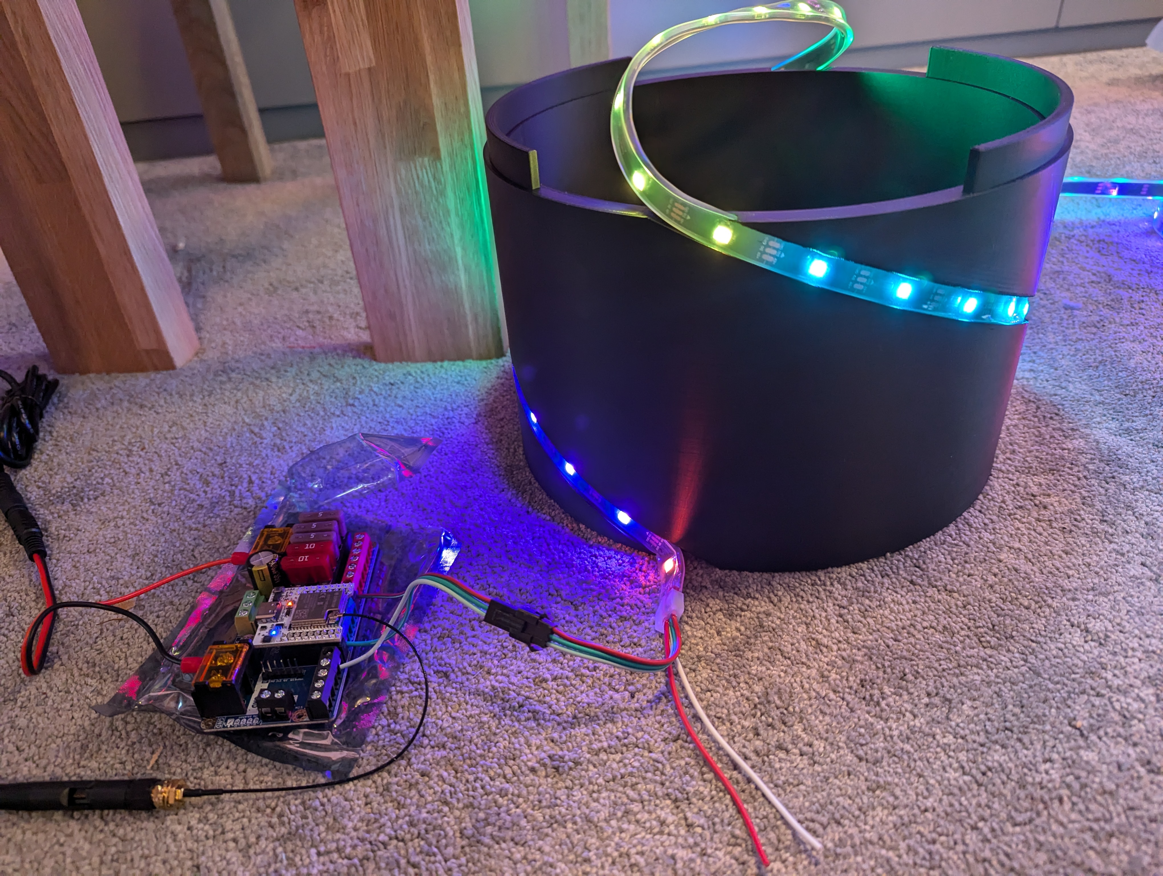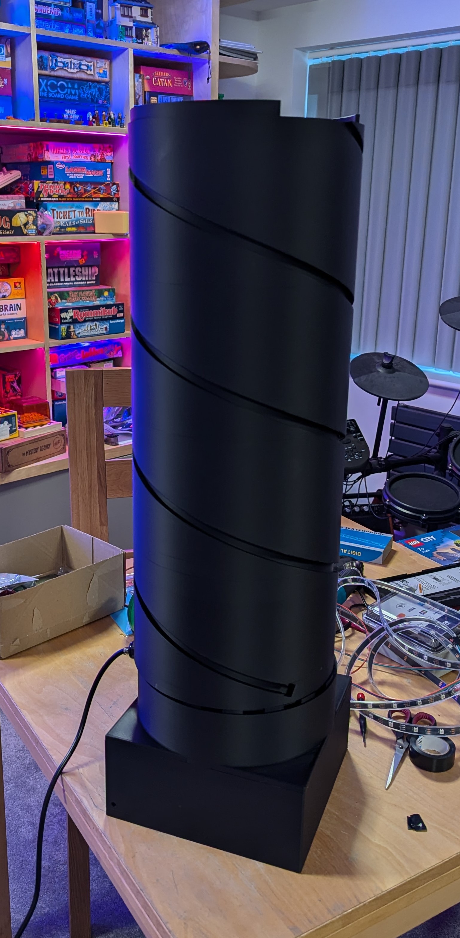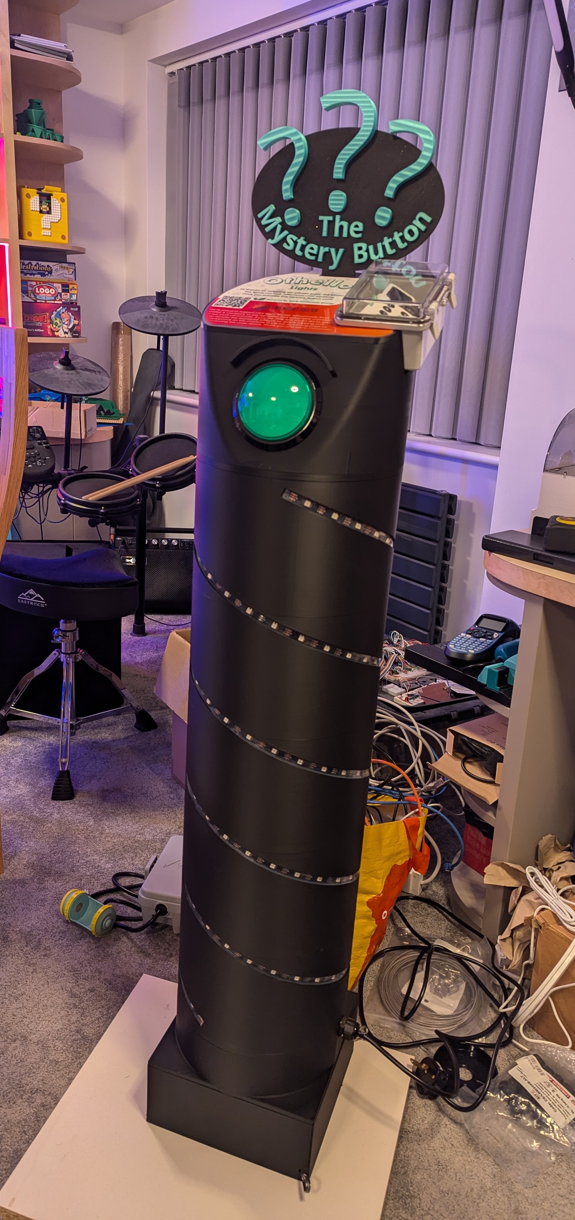 I designed a tall pole on which the button could sit, along with the card machine. As big as my 3D printer could fit, and split into sections that could slot together, this is the biggest thing I’ve printed yet. Standing at 1.3m tall, it took around 96 hours to print. Two 2m strips of waterproof LEDs spiral around it, meeting at the top before wiring descends into the base. The core is glued together, but the top and base are modular to provide access for maintenance, and with the intention that I could replace the top to eg have a different button layout. The base houses a DigQuad running WLED, with two channels used for the LED strips and one for the button’s built-in light.