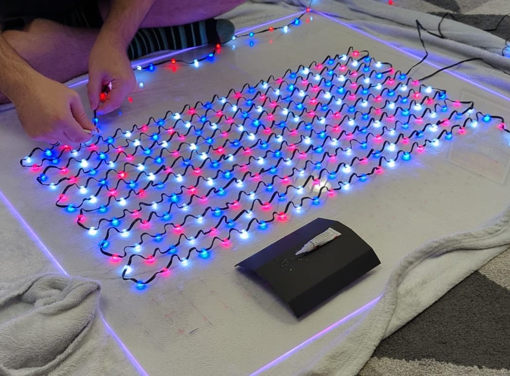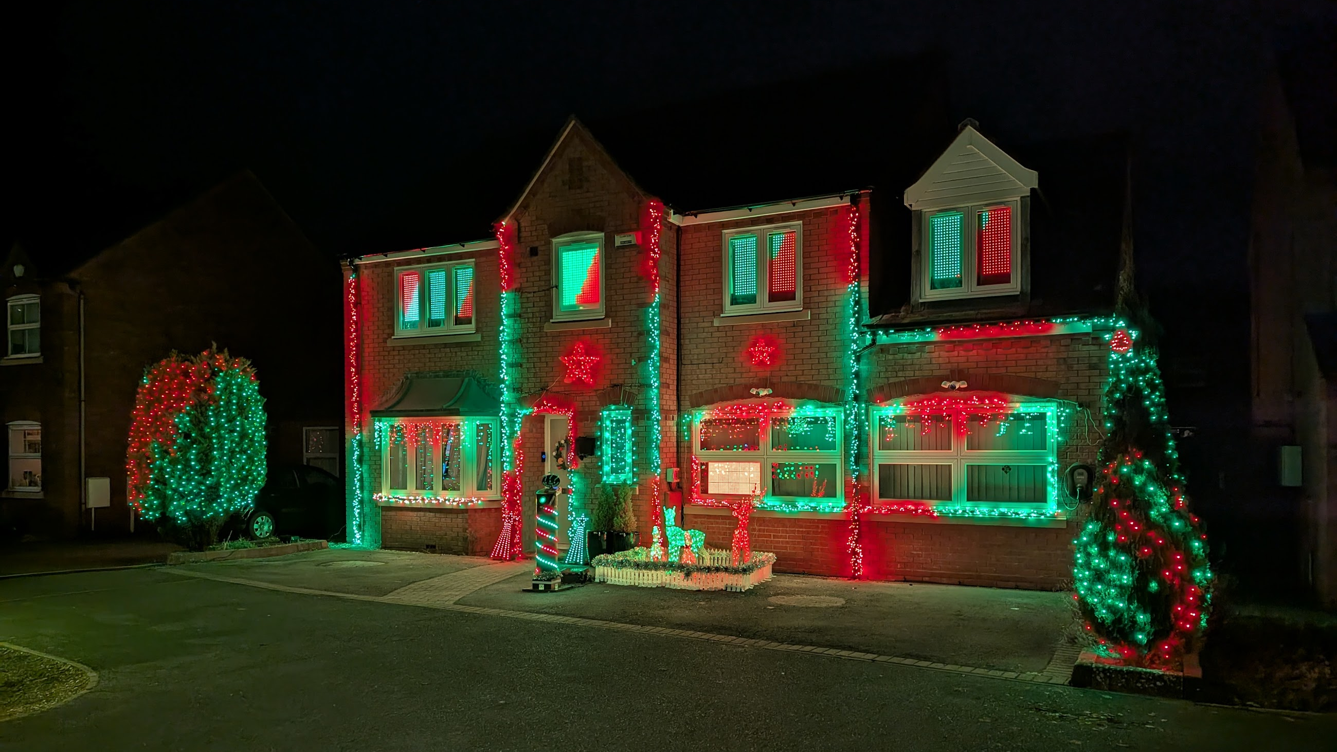 In previous years, the upstairs windows used Twinkly Strings, which produced a classic fuzzy fairy light look that’s fine for abstract patterns, but not for precise graphics. They also take hours to string up, take down and map into xLights. Every year I’m keen to reduce setup & takedown time – as this would otherwise just keep going up as more stuff is added to the display.