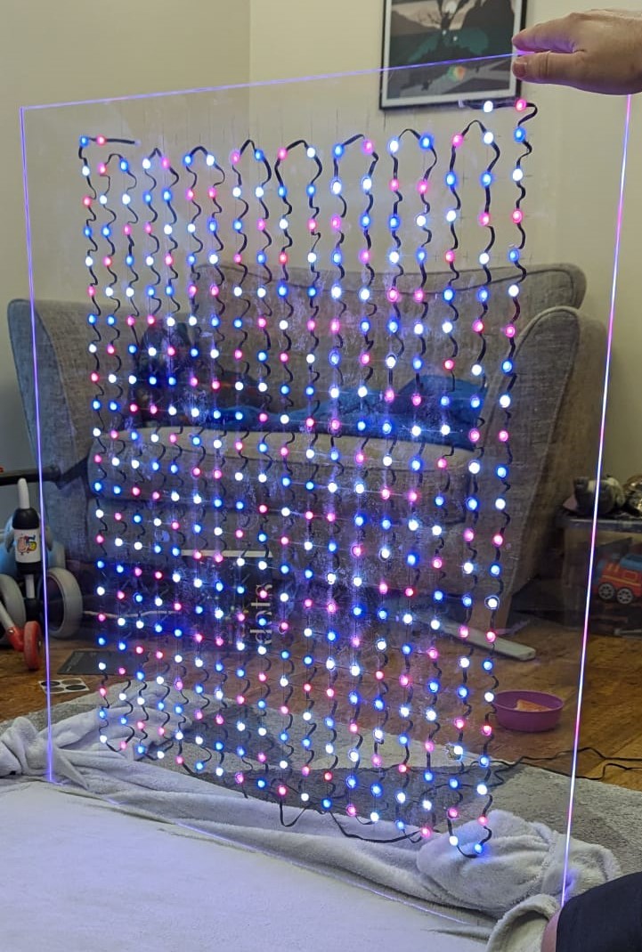 So this year, we replaced the Strings with Twinkly Dots, whose LEDs are positioning on the wire. This means it’s easy to create the straight lines required to setup a perfect grid. After some experiments, we super-glued all 1800 LEDs down onto perspex sheets. Each window’s grid has the same dimensions – 9 wide x 22 high, which means graphics can move across them consistently. The centre window is double-width, which makes a great focus point for the item carousel.